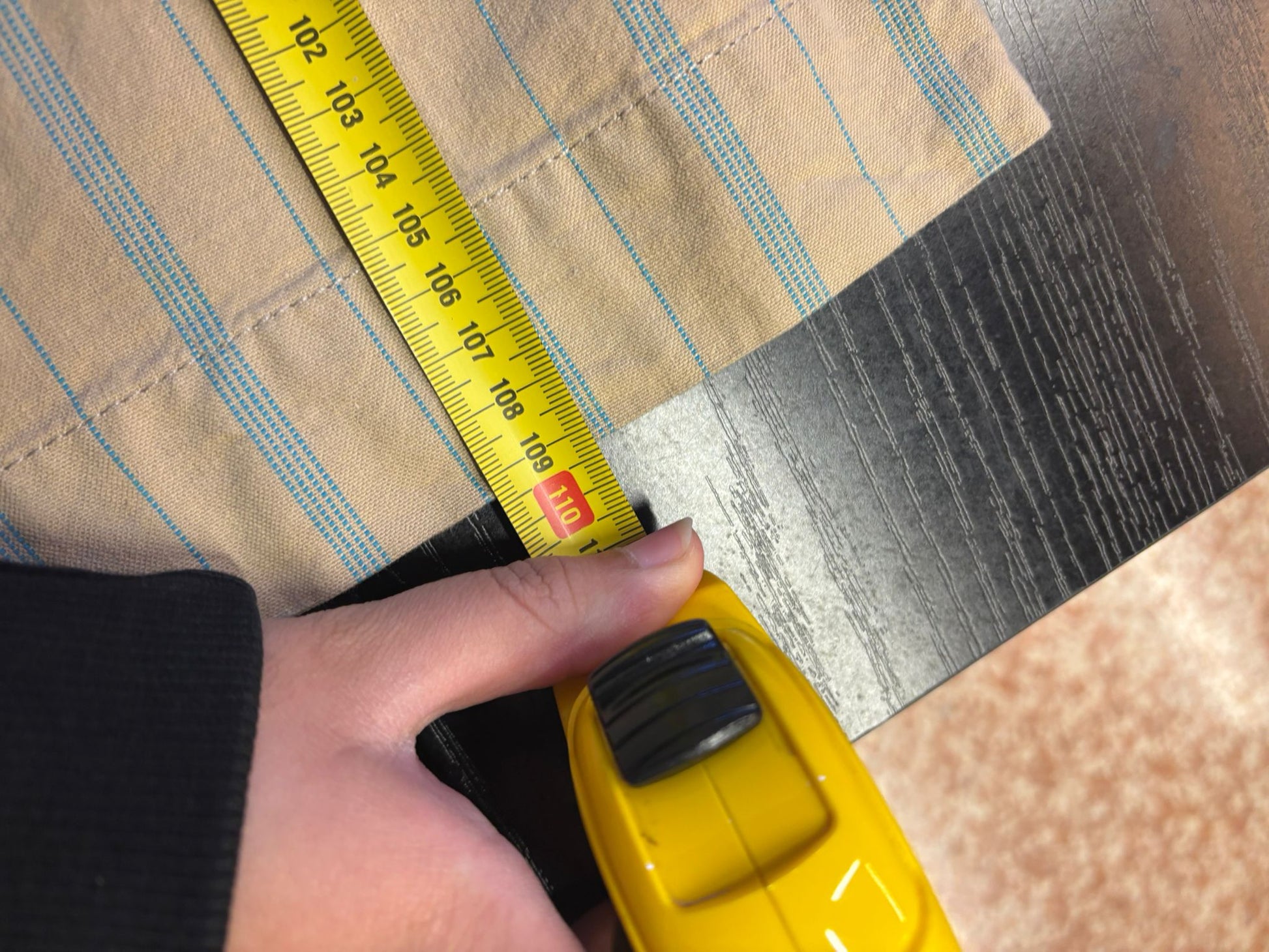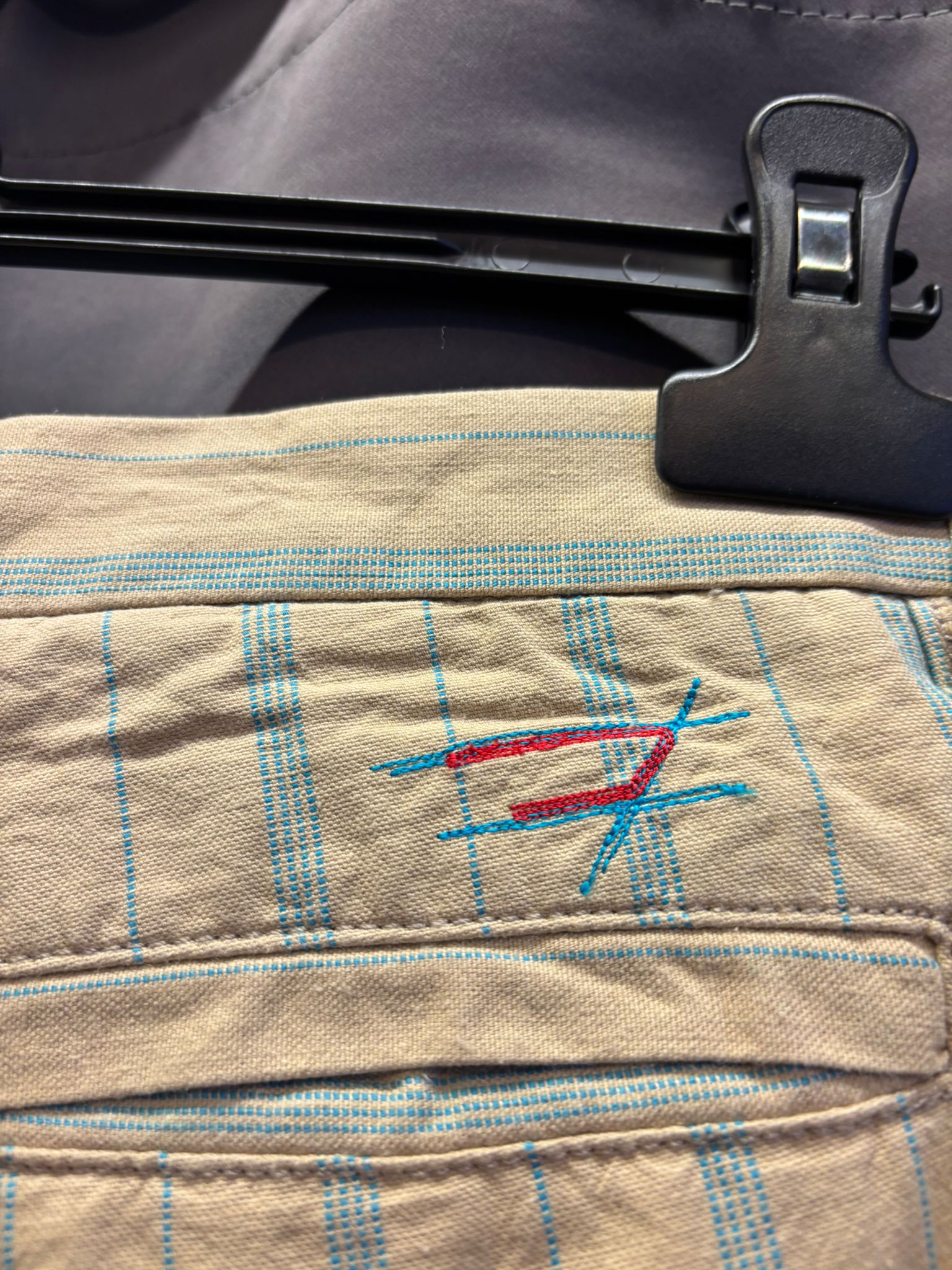 Colore beige a righe azzurre.